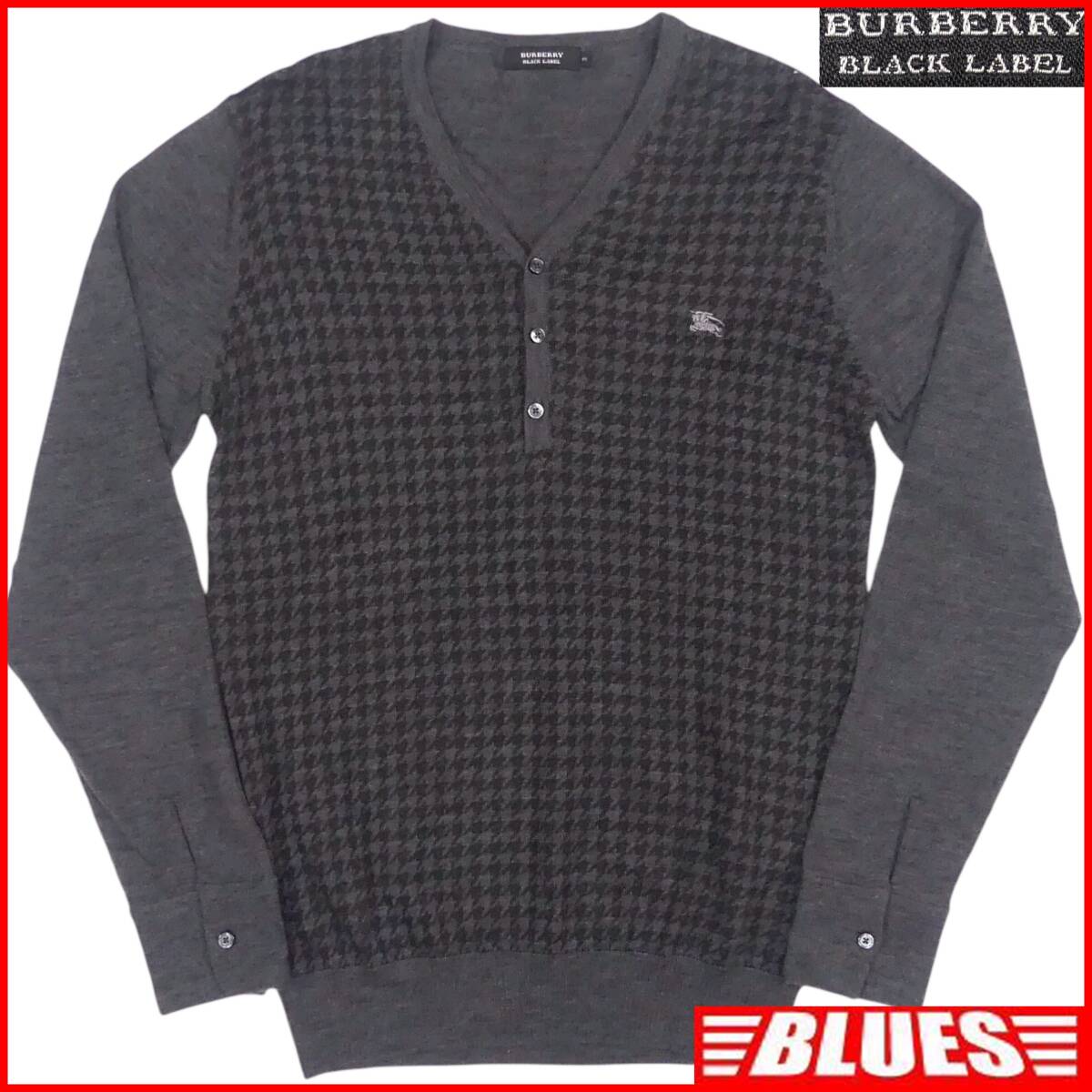 - 即決★BURBERRY BLACK LABEL★メンズ L 廃版 ニット セーター バーバリーブラックレーベル 3 グレー チェック 千鳥格子 ウール 刺繍