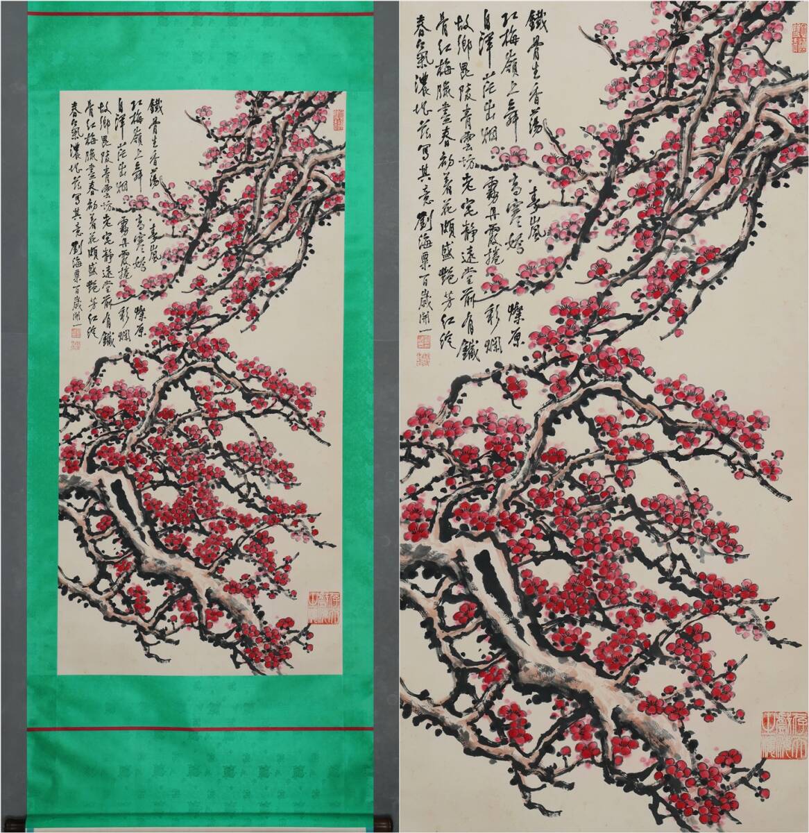> 古美術 掛け軸 中国・近現代 「劉海粟書」 紙本 【鉄骨紅梅図】 立軸 書道 巻き物 肉筆保証 唐物 古画 画心136x69cm LT-250376