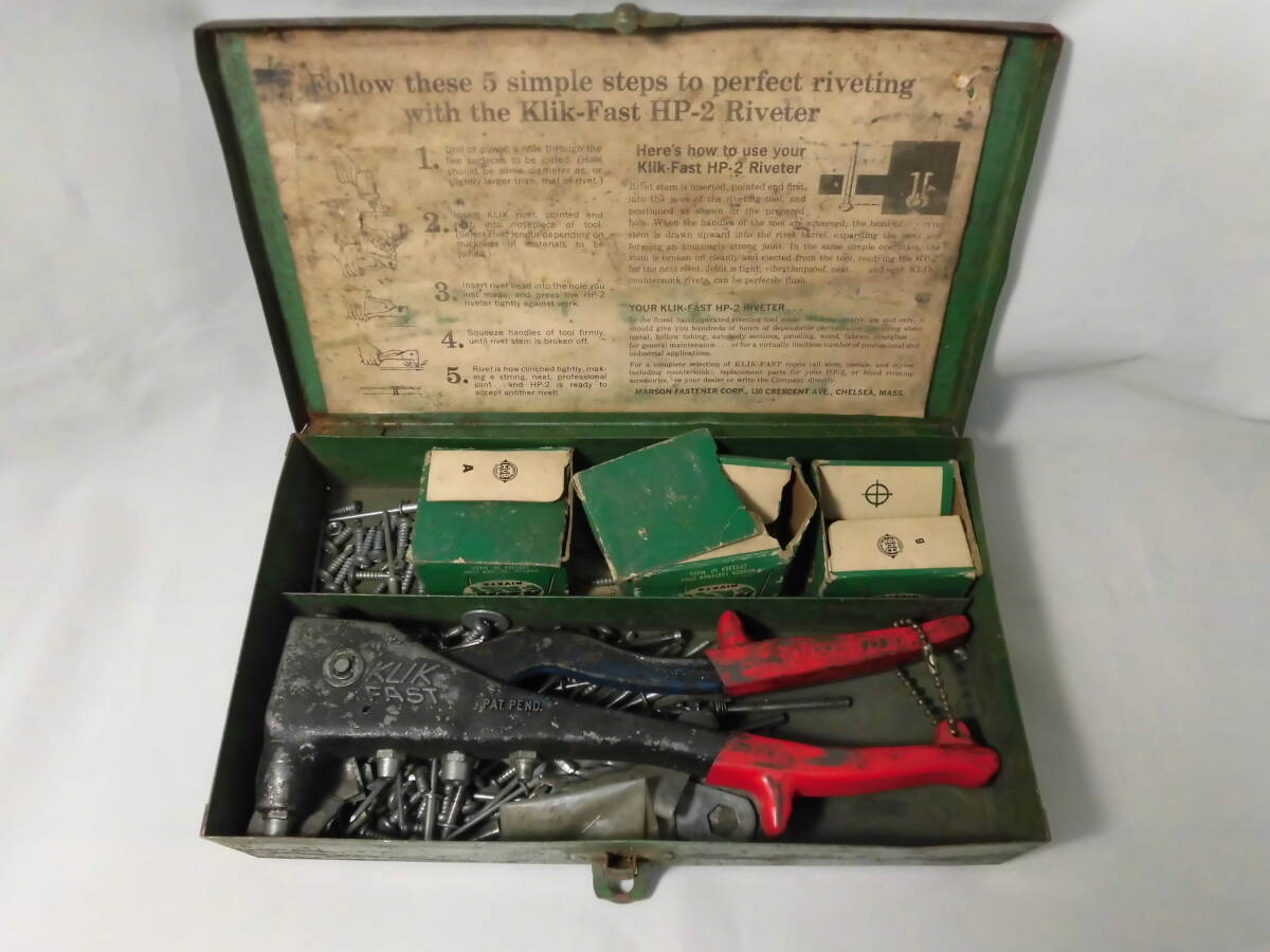 - ビンテージ ハンド リベッター KLIK FAST MARSON スチールボックス付 ガレージ 古工具 錆 レトロ インテリア インダストリアル