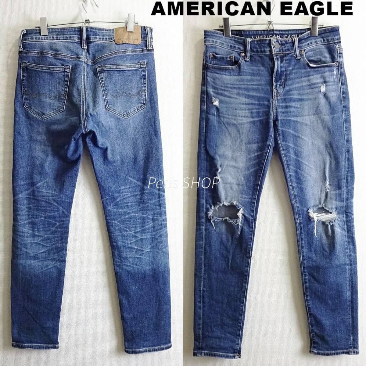 - 送料無★ アメリカンイーグル スキニーデニム W81cm 強ストレッチ クラッシュ加工 藍青 Sz.30 NLA I571
