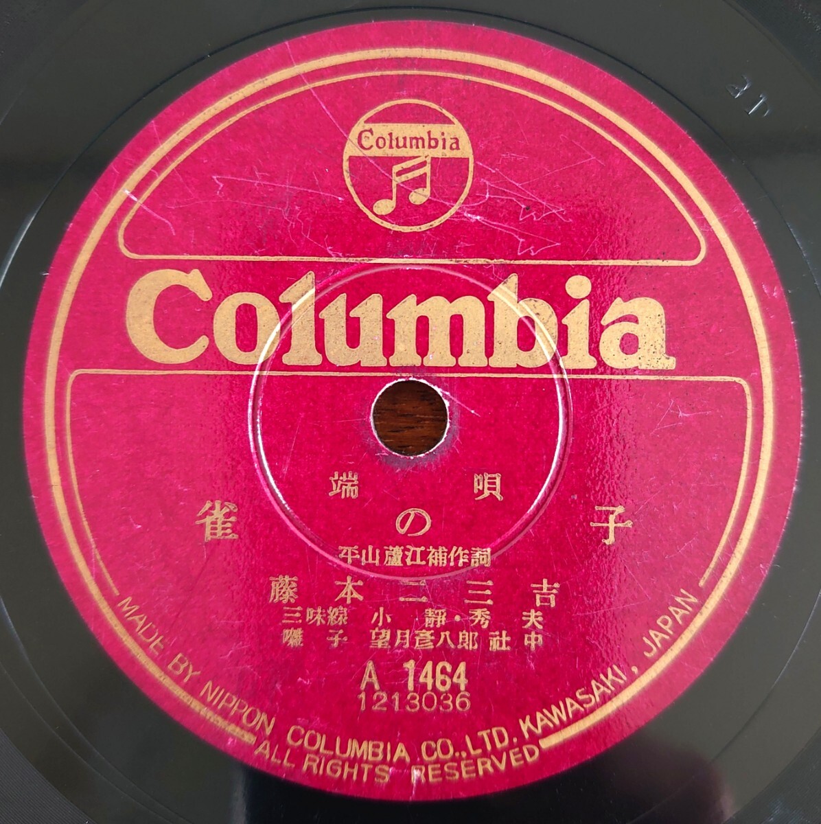 - 【SP盤レコード/ヒビ】Columbia A1464 端唄/ 雀の子/高砂/藤本二三吉