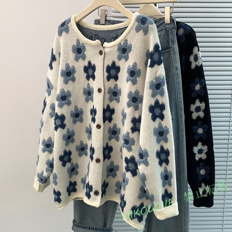 > ☆新品 秋冬 ゆったり大きいサイズ 体型カバー おしゃれ 花柄ジャガードニットセーター ニットカーディガンコート 白 MK658