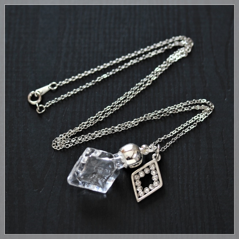 - F7401N/ダイヤ型 硝子の香水瓶ネックレス 菱形チャーム 銀色 ペンダント アロマペンダントにも変更可 ダイヤモンド型 ひし形 菱型 硝子