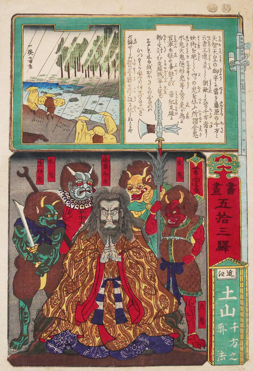 - 【真作】浮世絵『 一英斎芳艶 書画五十三驛 近江土山 千方之邪法 』彩色木版摺 古文書古画 錦絵美人図 中国唐物唐画