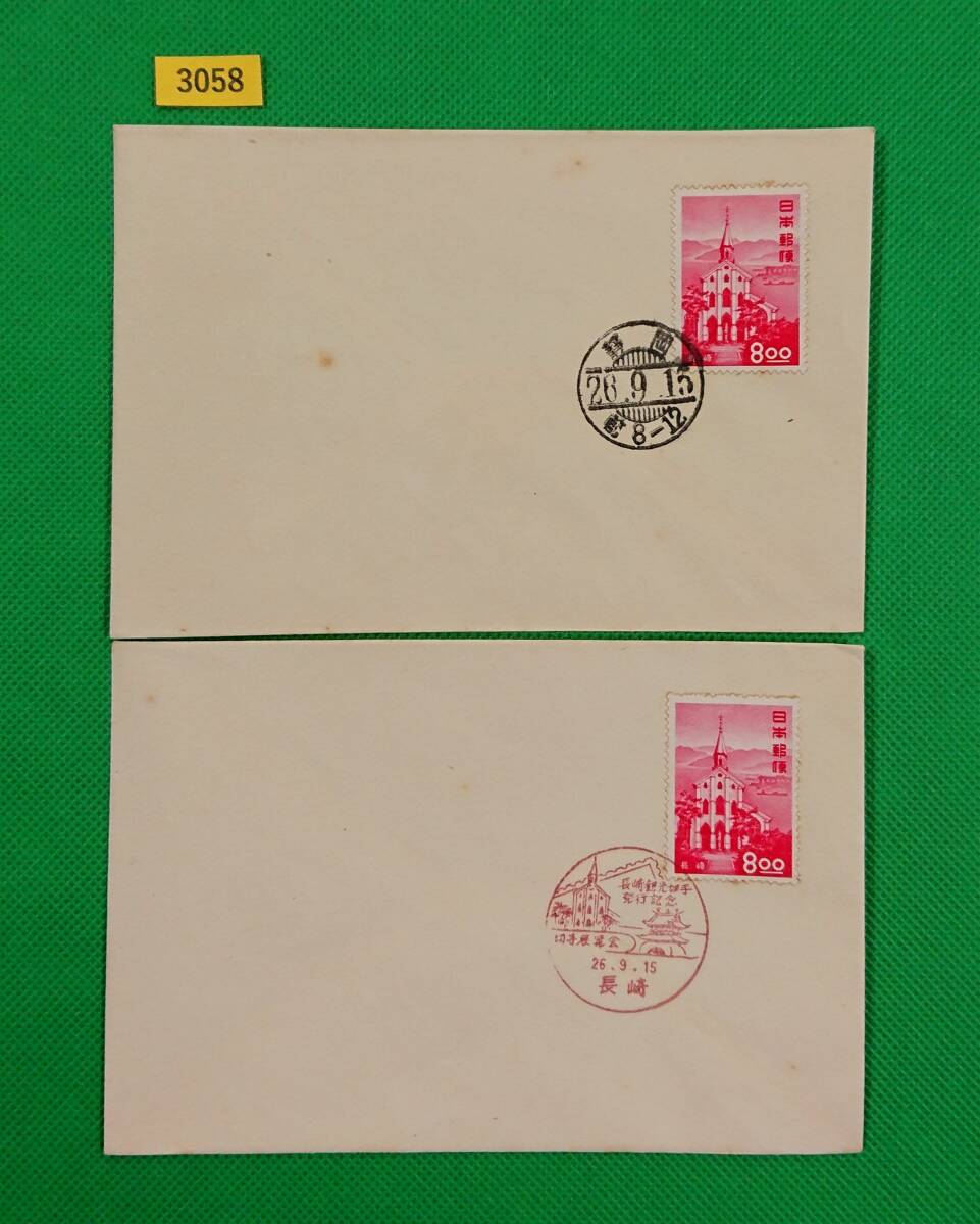 > FDC/観光地百選シリーズ/長崎/大浦天主堂/2種/初日印/静岡和文普通印/長崎記念印/私制版/解説書無し/1951年9月15日/初日カバー/№3058