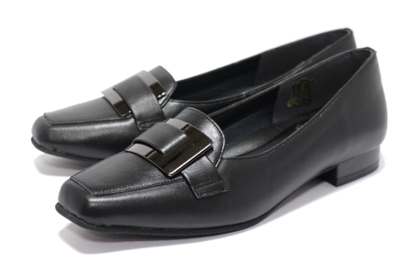 - 新品日本製レディース本革カジュアルパンプス カジパン ローヒールパンプス バックル レザー 牛革 ブラック 23.5cm
