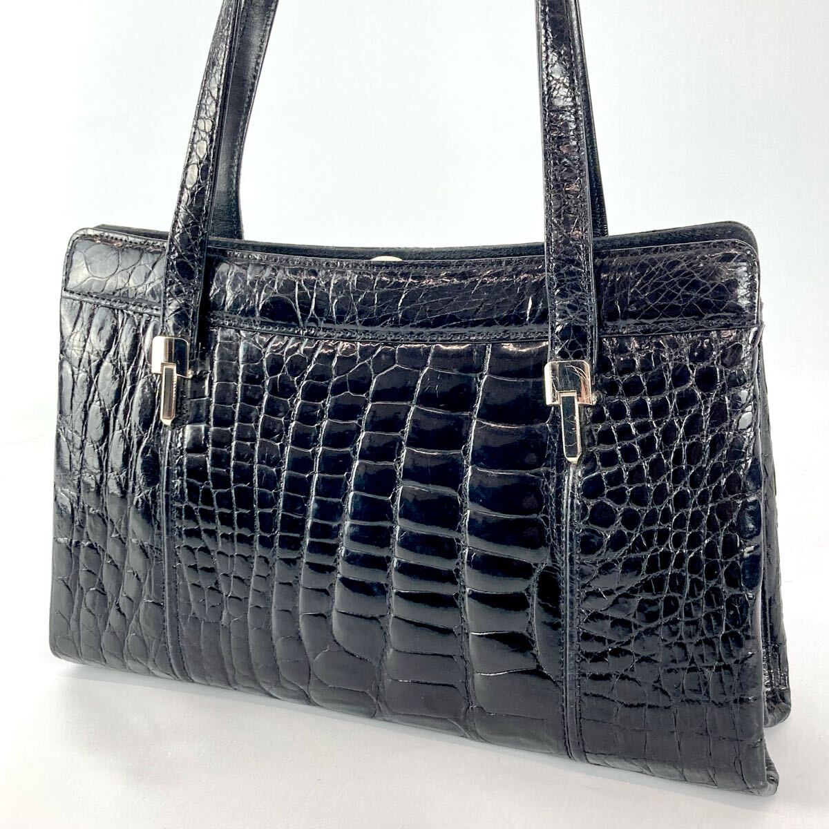 - エキゾチックレザー ハンドバッグ クロコダイル シャイニング 光沢 がま口 金具シルバー レディース鞄 ブラック 黒