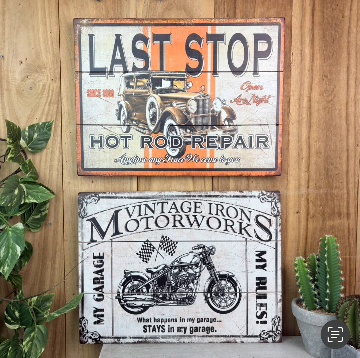 - カフェインテリアパネル2点セット木製アンティーク調壁掛看板サインボードナチュラルウッドパネルビンテージバイク