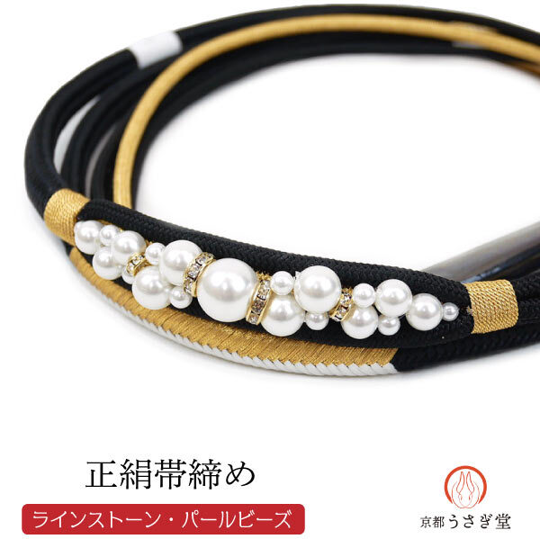 - 正絹 飾り帯締め パールビーズ ラインストーン 黒 日本製 oj-048 成人式