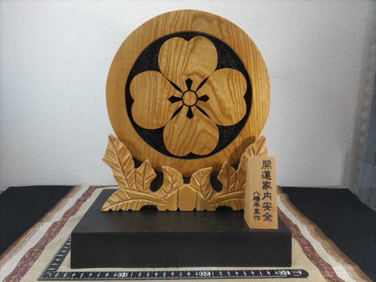 - ■送料無料!■家紋の置物・H34×W28.5×D16cm■木製■北海道・木彫り民芸品・阿寒湖■夫婦円満・家内安全■台・立札付き!