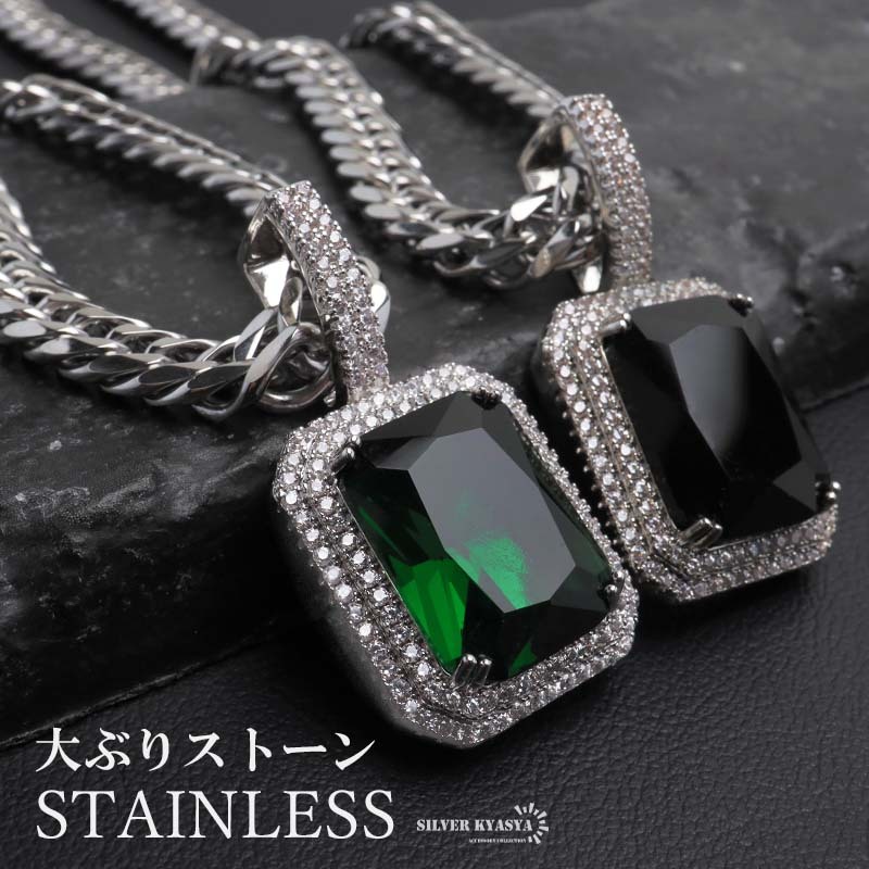 - (グリーン、60cm) ステンレス ストーンネックレス ブリンブリン 大粒 ごつめネックレス ダブル喜平ネックレス メンズ