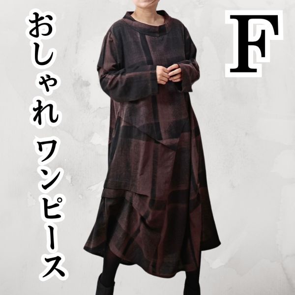 - 【新品】おしゃれロングワンピース個性的レディース春秋冬長袖トップスチュニック着痩せ体型カバーマタニティ綿100コットン重ね着ブラウン