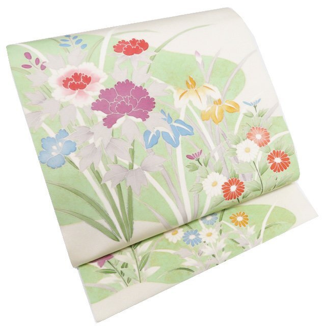 > 名古屋帯 なごや帯 中古 リサイクル 正絹 カジュアル 仕立て上がり 塩瀬 花の図 灰白色 多色 きもの北條 A1166-15