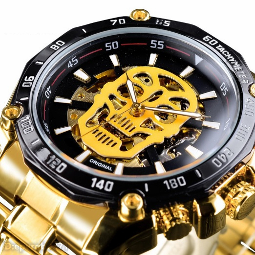 > 男性腕時計 新品 アナログ 機械式自動巻 3針 スカル メンズ ウォッチ 夜光表示 防水3ATM ステンレスベルト アメカジ /ゴールド