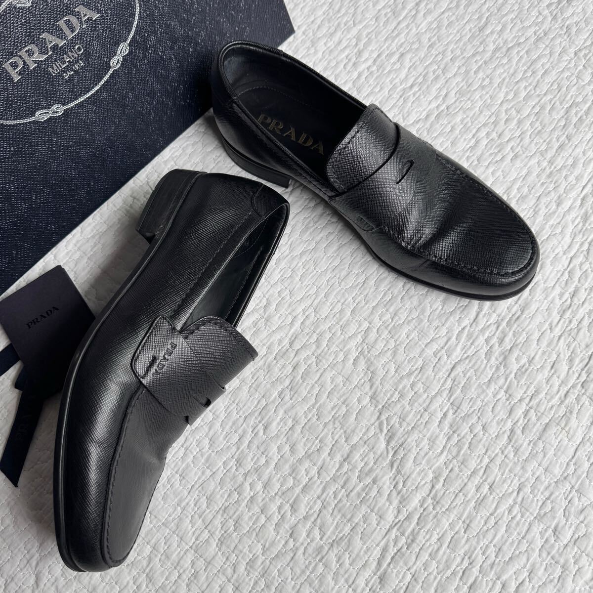 > 美品 高級 PRADA サフィアーノ コインローファー ロゴ ブラック 黒 レザー 51/2 25.5cm 箱付き メンズ
