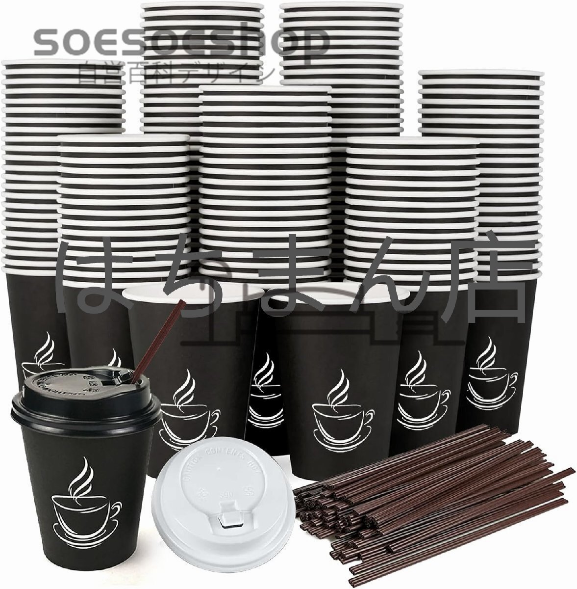 - 紙コップ 使い捨て 蓋付き 300個入セット 撹拌可能ストロー付き 業務用 コーヒー カップ 耐熱 ペーパーカップ 250ML black