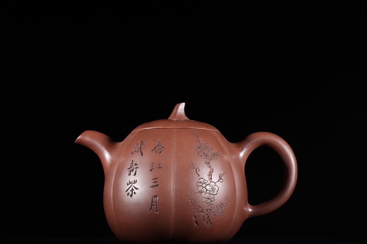 - 「紫砂彫 詩文刻絵香瓜紫砂茶壺 范大生銘 清時代」陶磁器 急須 茶道具 古賞物 中国古美術 旧蔵出