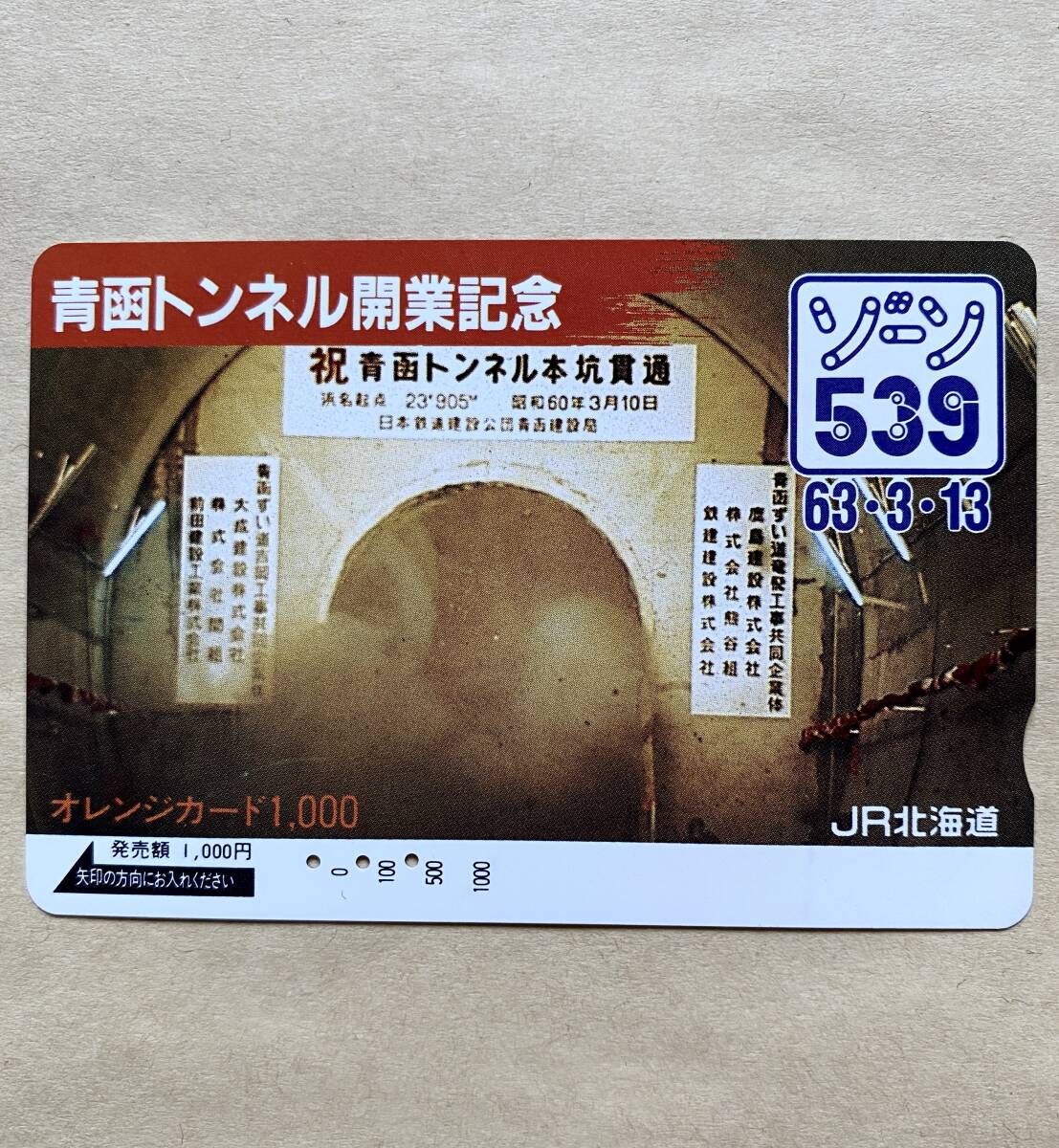 - 【使用済】 オレンジカード JR北海道 青函トンネル開業記念 ゾーン539 63.3.13 青函隧道