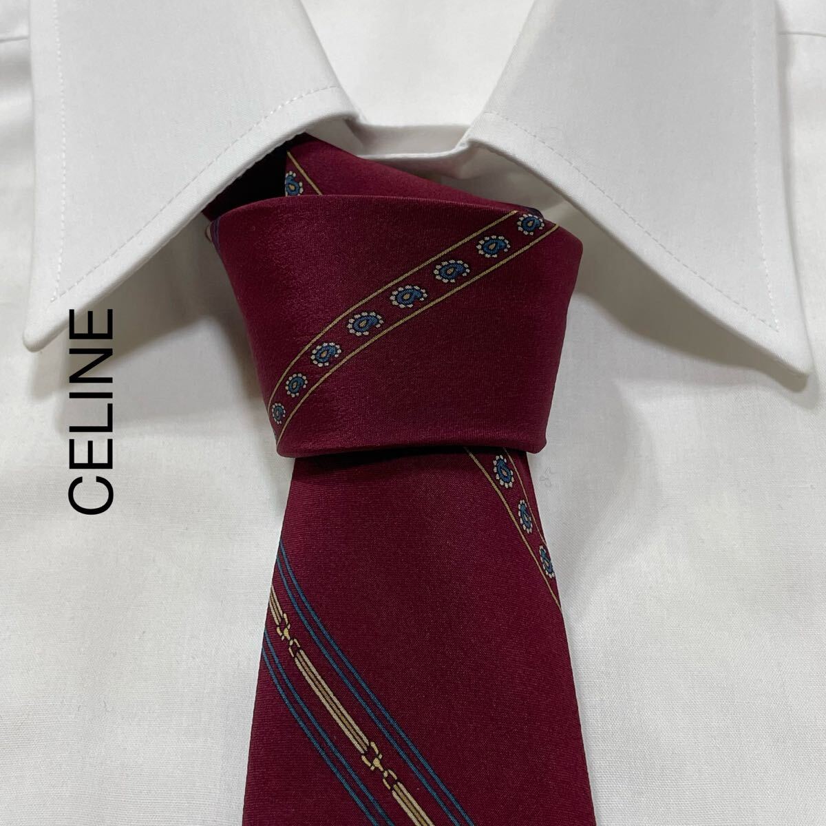 - CELINE セリーヌ ストライプ デザイン シルク ネクタイ スペイン製 ワイン TG1262