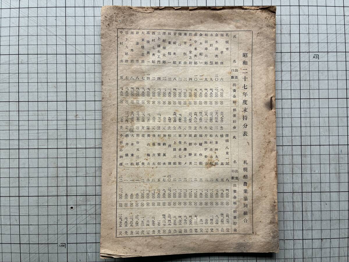 - 『昭和二十七年度末持分表』札幌酪農業協同組合 ※氏名・出資口数・出資金額・据置貯金 札幌村・琴似町・手稲村・豊平町・篠路村 他 00166