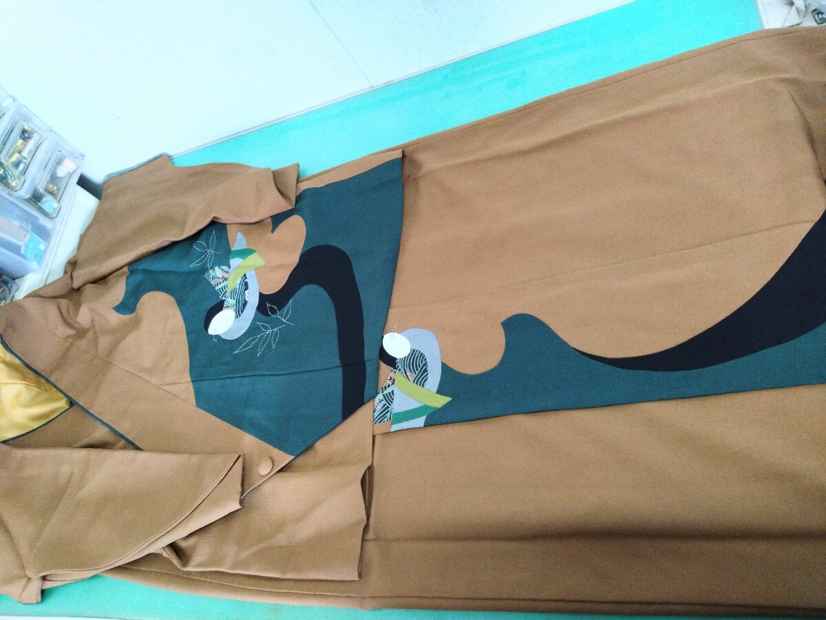 > ●117 しょうざん 着やすい 二部式 着物 ポリ縮緬 黄土色 深緑 辛色 鴛鴦 パッチワーク 刺し子 柄 和洋 デザイン レディース M 中古 ③