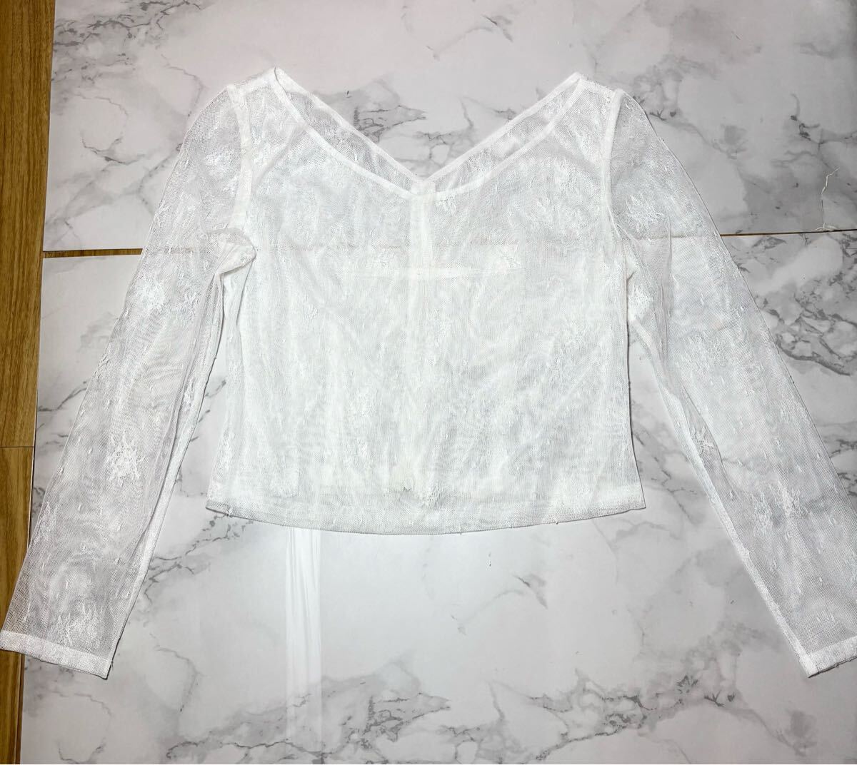 - ホワイト透け感レース長袖 クロップドブラウス未使用