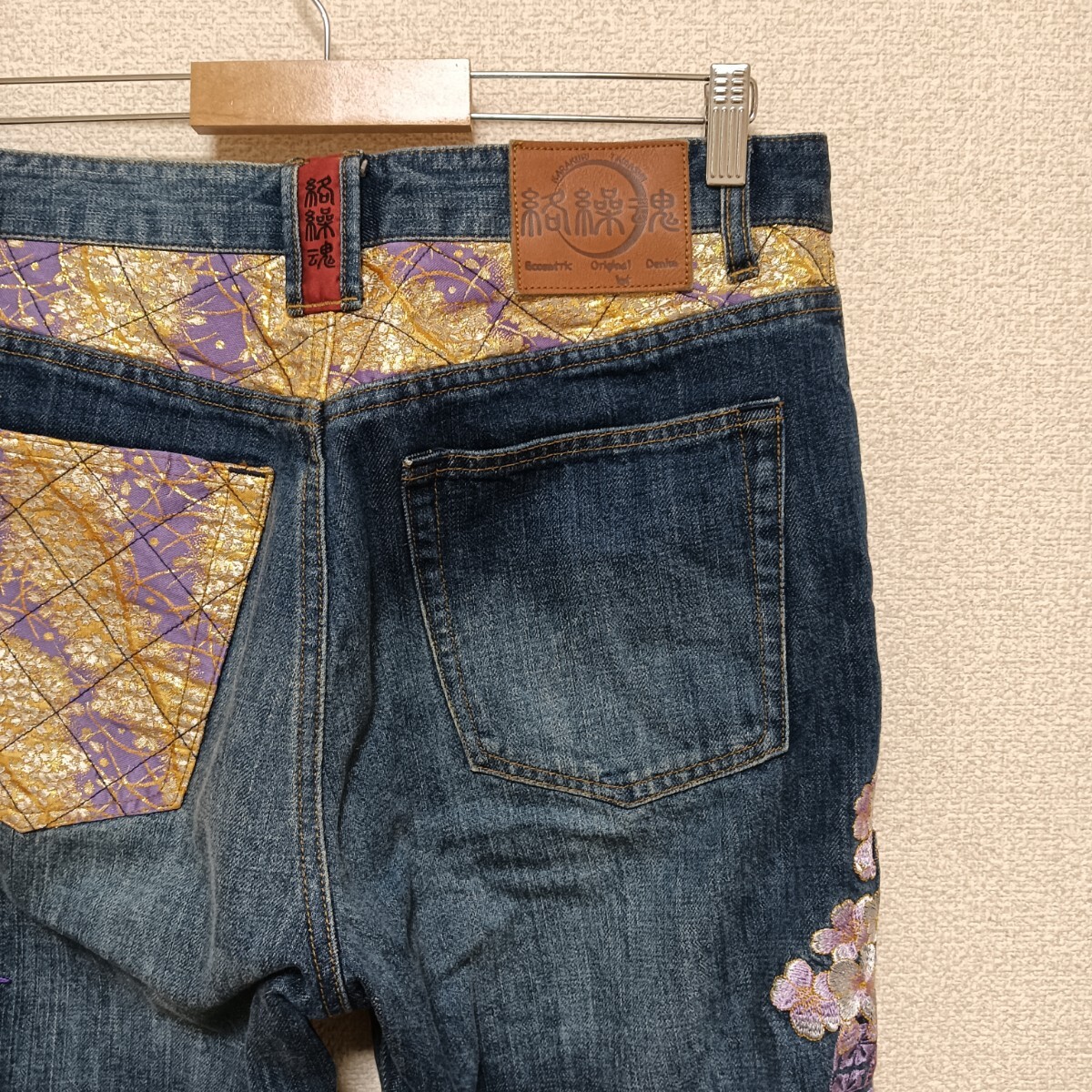 > 美品★絡繰魂 C231735 デニムパンツ 鳳凰 和柄 刺繍&ダメージ加工 ジーンズ ジーパン ボトムス W34 アーカイブ レア 希少 廃盤 古着 USED