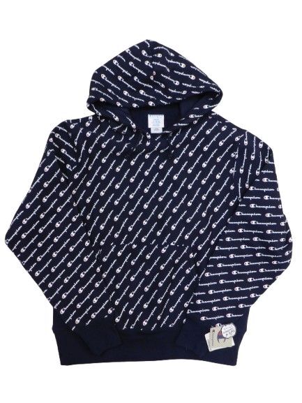 > US企画/USモデル チャンピオン リバースウィーブ パーカー サイズL 総ロゴプリント ネイビー S2974-K5Q Champion タグ付 展示品