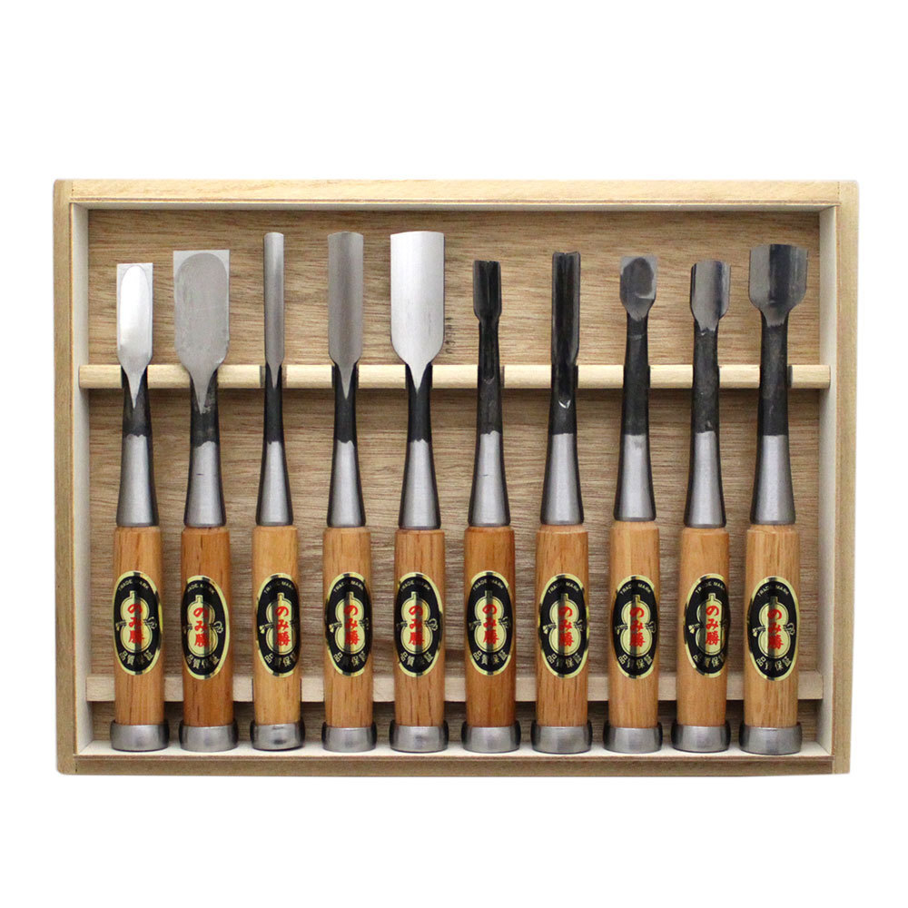 - 木彫鑿 10本組 のみ勝 赤樫柄 木箱入 のみ ノミ 木彫り 彫刻 木工細工 鑿 セット