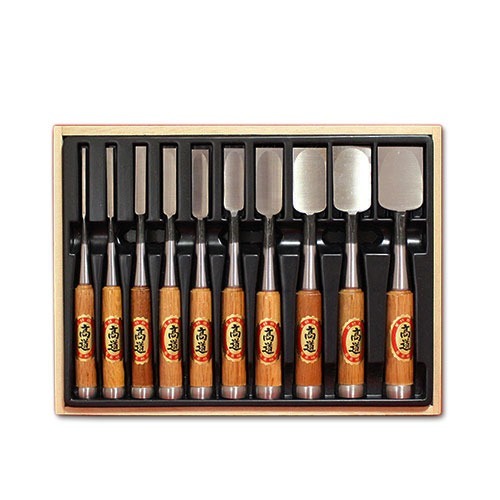 - 播州三木 高道 高芝郁夫鑿 追入のみ 白鋼 赤樫柄 10本組 木箱入 鑿 セット 大工道具