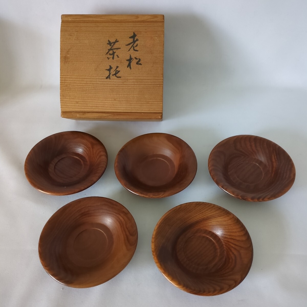 - 4230 太田芝山 老松 茶托 五客 共箱 木製 茶道具 県重要無形文化財