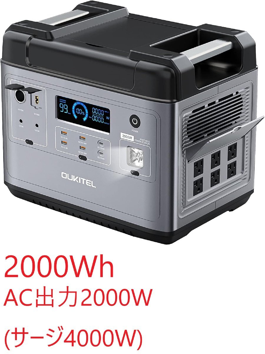 精密機器となりますので輸送中の衝撃や振動で外部破損ではない不具合が起きる場合もあります。返品や交換は出来ませんので、メーカー修理対応のみとなります。---------------------------------------------------------------------------------------------------OUKITEL P2001 ポータブル電源・UPS無停電電源装置サイス(L×W×H) 394mm×279mm×330mm電池のタイプ 32130リン酸鉄リチウムイオン(LifePO4)電池パック定格容量 2,000Wh 625600mAhバッテリー寿命 3,500回、フル充電サイクル2,000回後に当初容量の約80%AC出力 定格2,000W(サーシ4,000W)純正弦波、 100V(95~107V)x6ホート、50/60Hz(自動切替)、過負荷・短絡保護機能搭載USB出力 USB-A端子(18W急速充電対応)×2、USB-A端子(5V 2.4A)×2、USB-C端子×2(5-20V/5.0A、100W MAX)DC出力 2.1mm DC(12V/3A)センターフラス x2、XT60コネクタ(12V/10A)×1、ACC(車載アクセサリー)ソケット(12V/10A)×1AC入力 100~120V(100V/110V可切) 50/60Hz 定格1,100Wソーラーチャージャー充電時間 充電残量0%から100%充電まて→約5時間(純正200Wソーラーハネル2枚直列接続時・理論値)家庭用コンセント充電時間 充電残量0%から100%充電まで→1.8時間以下長期保存時充電率 50~70%(直射日光や高温高湿を避けて保管)この商品について