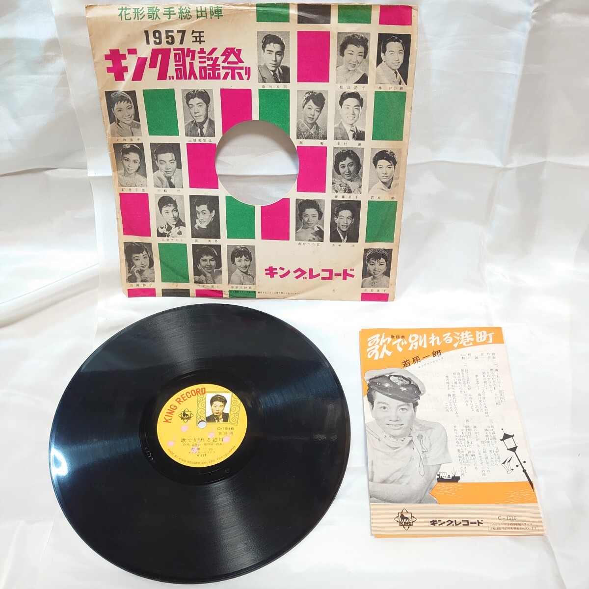 - 442【古い/SP盤レコード】若原一郎 歌で別れる港町 心配するなよ C-1516 歌詞カード 袋付き 和モノ 蓄音機 昭和歌謡曲 懐メロ