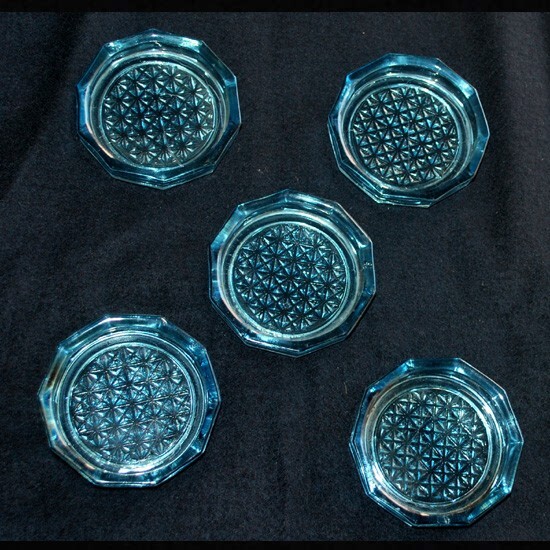 - ●2307●昭和レトロ雑貨 ◆ アクアマリン色 型抜きガラス コースター 5 個 ◆ 泡や糸引き跡など趣きあり!