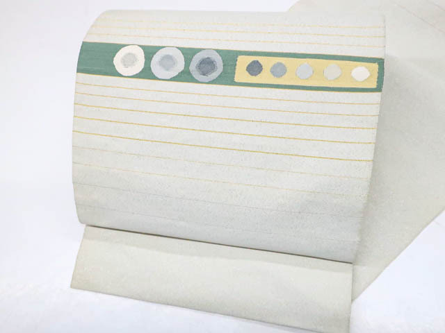 - 《古美術京松》【着物】八寸名古屋帯 幾何学文 銀糸 太鼓柄 開き仕立て r7b04-81