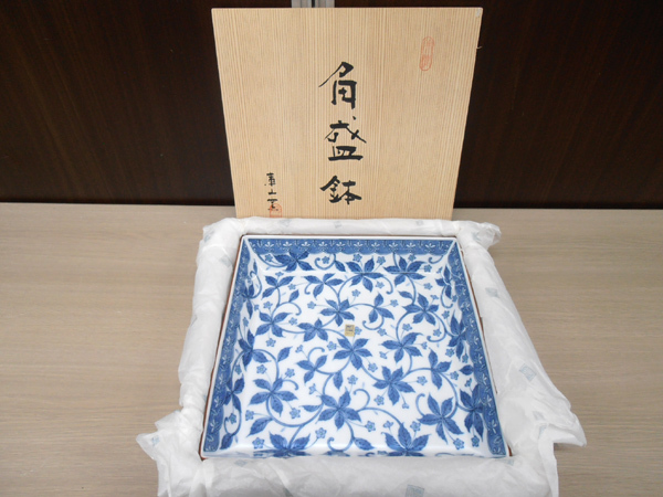 未使用品 庫山窯 前畑陶器 染付 J-409 青華 角盛鉢 葉模様 和食器 深皿 木箱入り 苫小牧西店