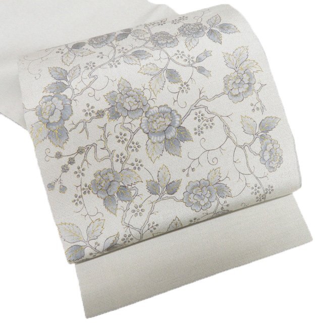 - 袋帯 中古 リサイクル 正絹 カジュアル 仕立て上がり 塩沢 お太鼓柄 花の図 絹鼠色 鼠色 金 きもの北條 A1178-15