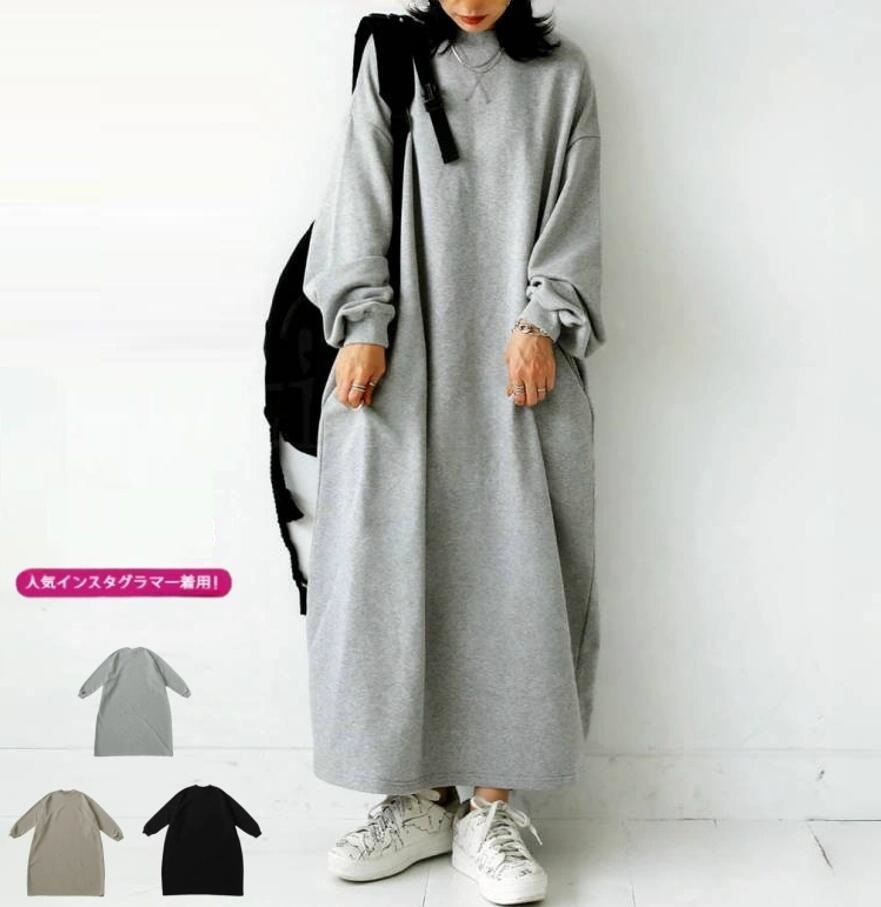 - 新品* カジュアル ロングワンピース 長袖 ワンピ Aライン お洒落 オシャレ マキシワンピース 体型カバー ゆったり シンプル* 灰