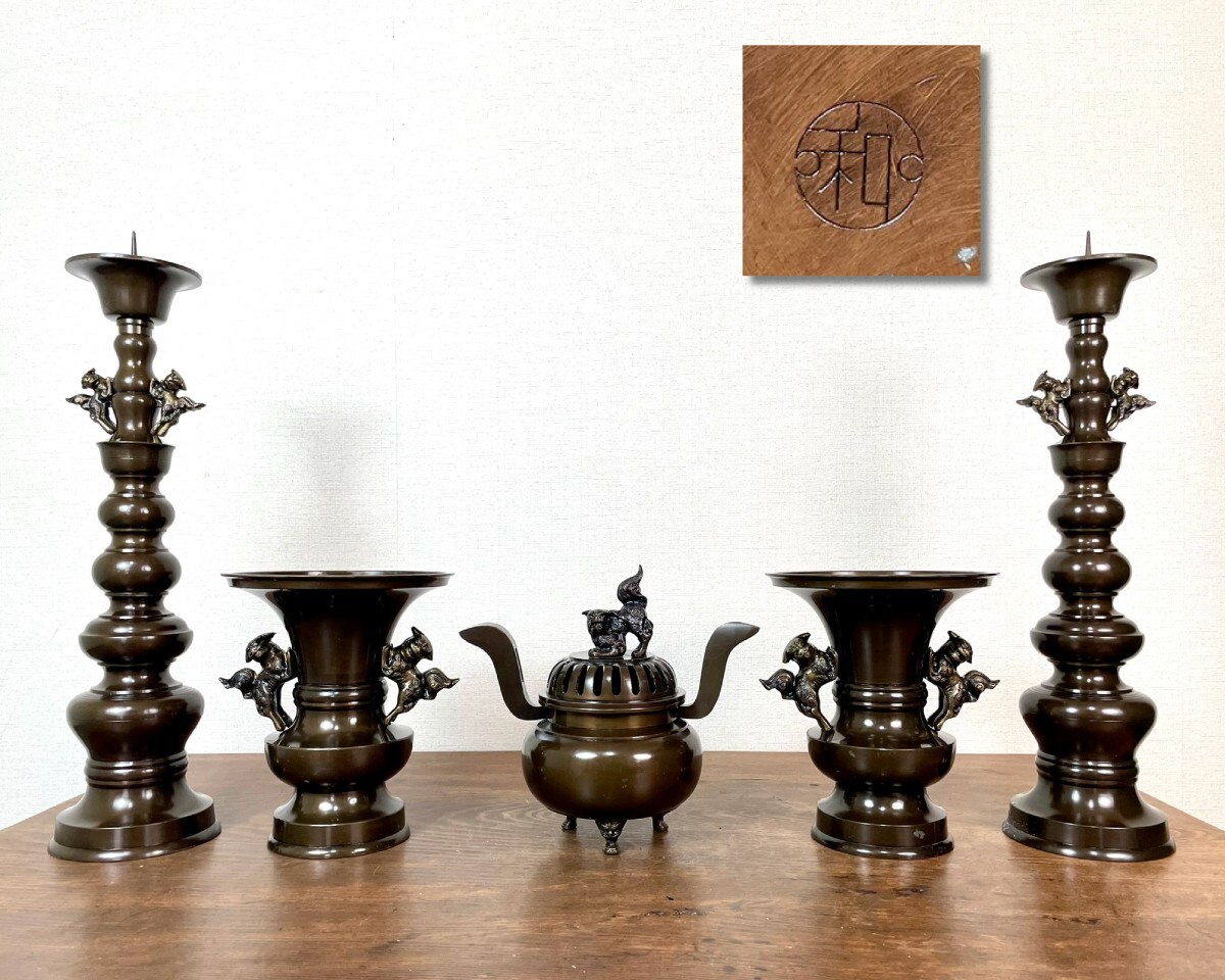 - A74 ① 寺院用 丸和 獅子掛 五具足 香炉 燭台 花器 仏具 祭壇