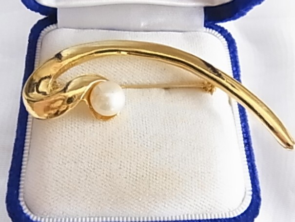> ■ビンテージ/ヴィンテージ 美しいカーブデザインのゴールドトーン 金色系 fakeパールが1粒煌く インパクト感 レトロのブローチ
