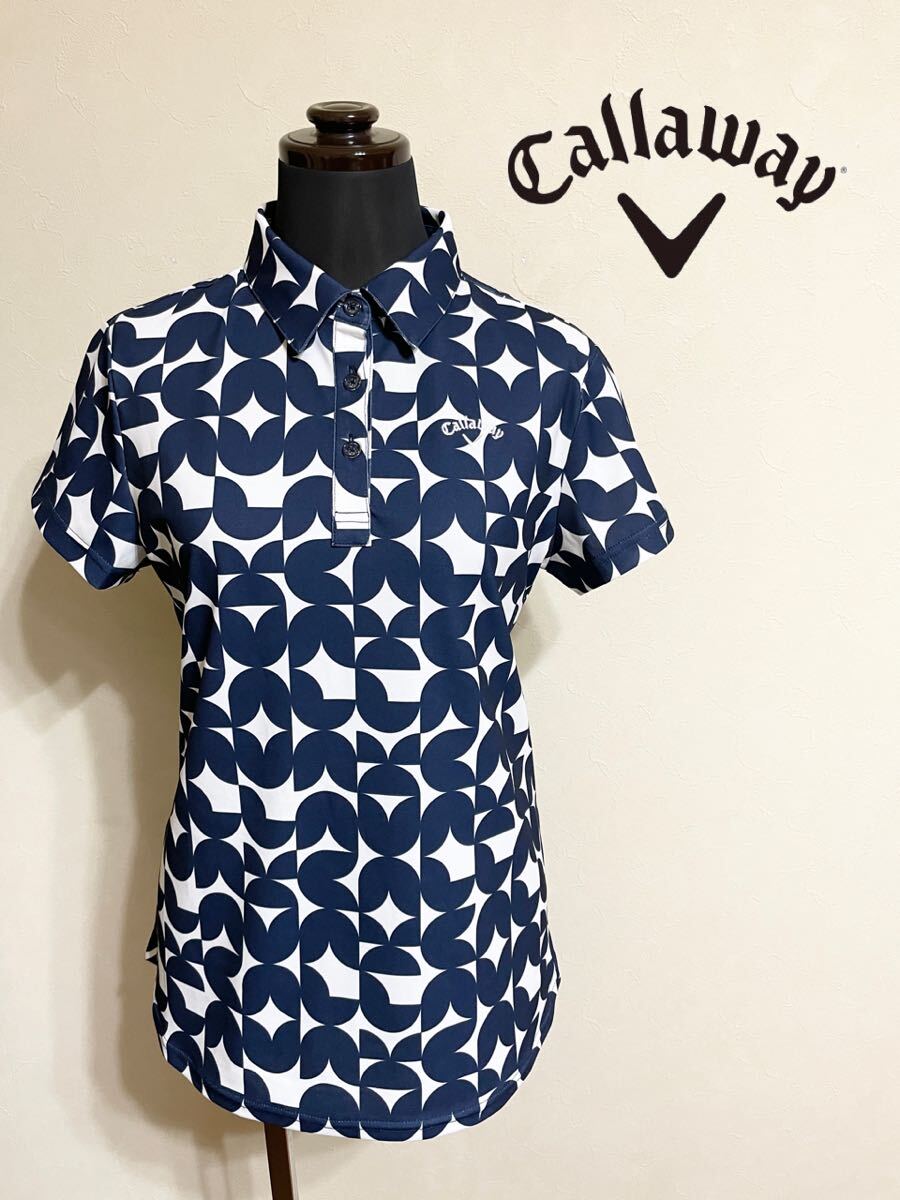 - 【美品】 callaway golf キャロウェイ ゴルフ ウェアー レディース 総柄 ドライポロシャツ トップス サイズS 半袖 ネイビー 白 C24134204
