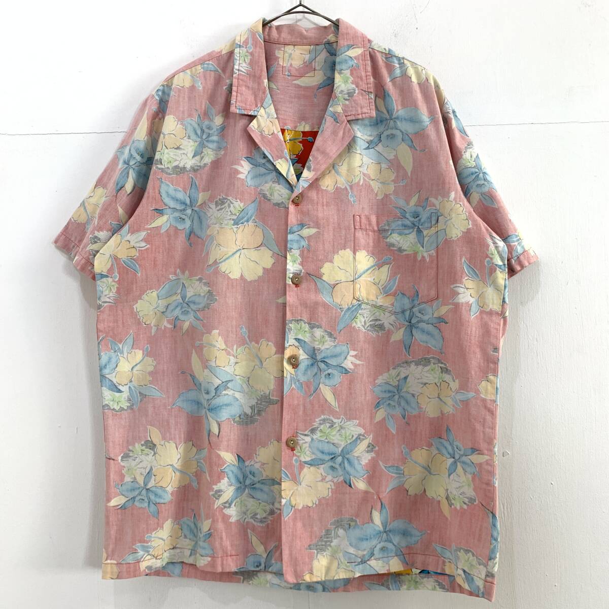 - ☆UNKNOWN リメイク物? ハンドメイド? 裏地使い リバースプリント 総柄 花柄 半袖アロハシャツ 開襟 レッド【レターパックプラス郵送可】1