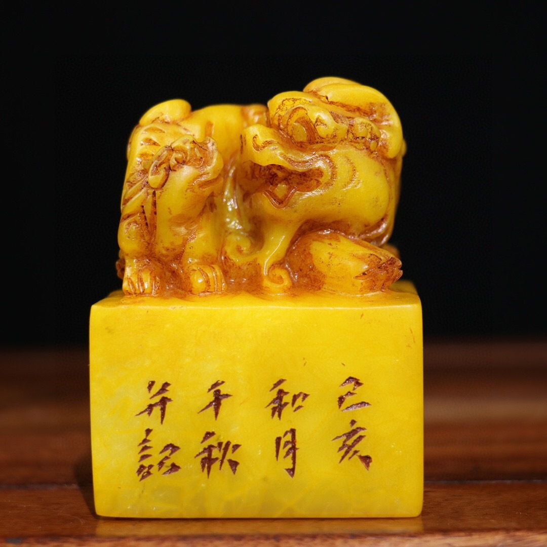 - 【超珍館蔵】寿山石 田黄石 細密彫 望子成龍印章 文房具 書道品 古賞物 古美術品 稀少珍蔵品