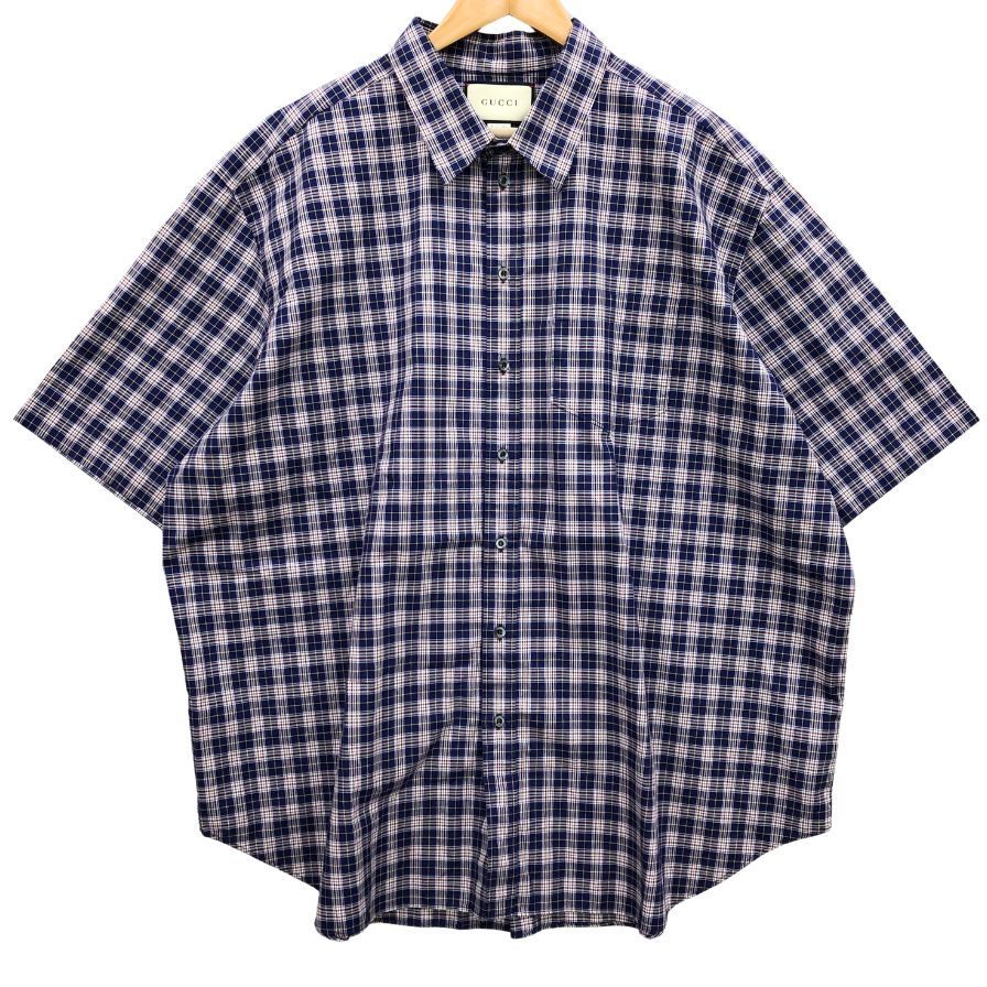 > 美品◆シャツ グッチ 18SS 半袖シャツ チェック メンズ サイズ48 ネイビー 557391 GUCCI 【AFB50】