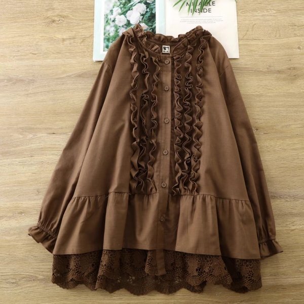 > xx ふんわり レースたっぷり チュニック ワイシャツ トップス 綿麻混 ゆったり オシャレ フリーサイズ ナチュラル 茶色系