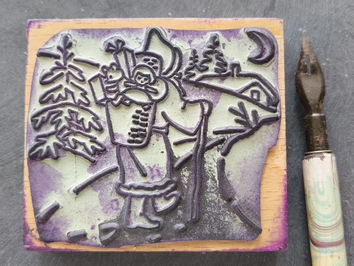 - 月夜 サンタクロース プレゼント 徒歩配達 フランス アンティーク 子供 スタンプ ヴィンテージ ハンコ イブの夜 デリバリー 杖