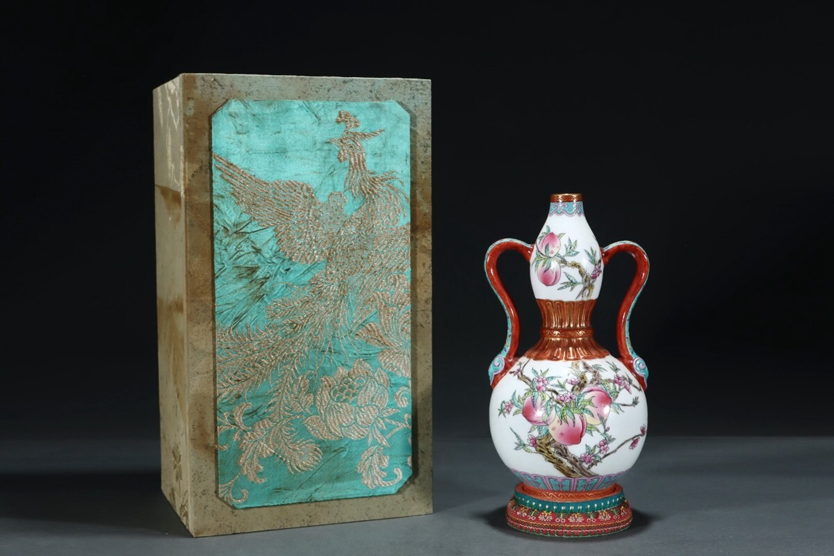 - 「清 乾隆年製 陶磁器 紅釉粉彩壽桃描金双耳葫蘆瓶」染付 置物 擺件 古賞物 中国古美術 旧蔵出
