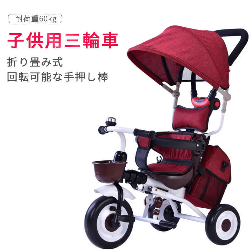 - 子供用三輪車 折り畳み式 子供用 三輪車 回転可能な手押し棒 ダブルブレーキ搭載 乗用玩具 幼児用 サンシェード付き 軽量