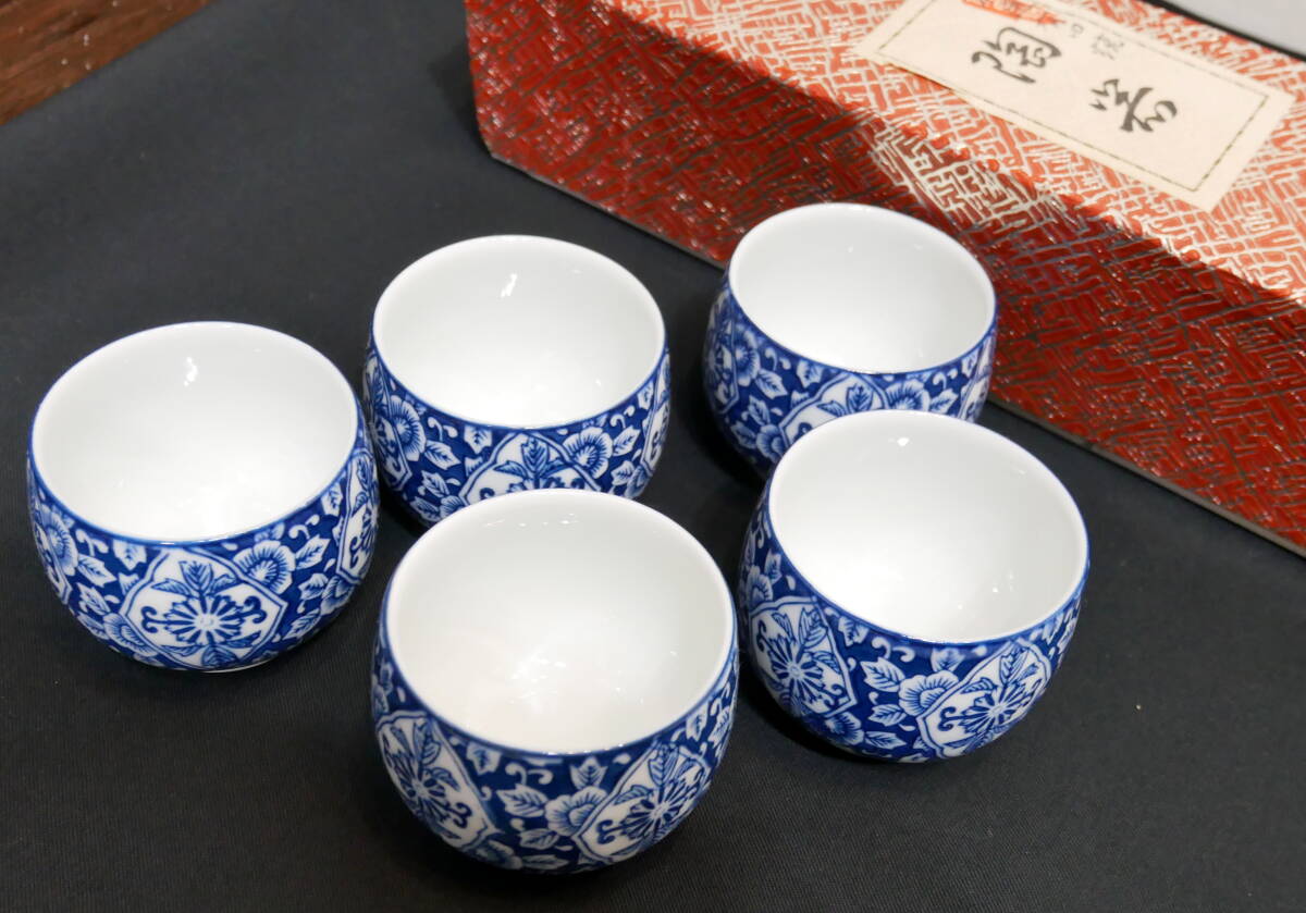 > ▲(R704-H177) 未使用 有田焼 西峰作 牡丹菊煎茶揃 5客セット 湯呑 茶器 和食器 口径約7cm×高さ約6cm 箱付き