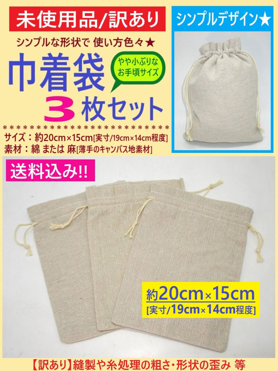 > 訳あり 未使用 無地 キャンバス地 巾着 袋 3枚 B 20×15 綿 または 麻 布 バッグ 薄手 小分け 収納 ラッピング 材料 ミニ 小さい 海外製